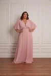 Leve, romântico e sofisticado este vestido longo de festa é confeccionado em chiffon fluido, proporcionando movimento natural e caimento elegante em cada passo.